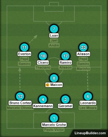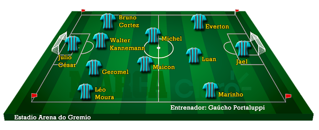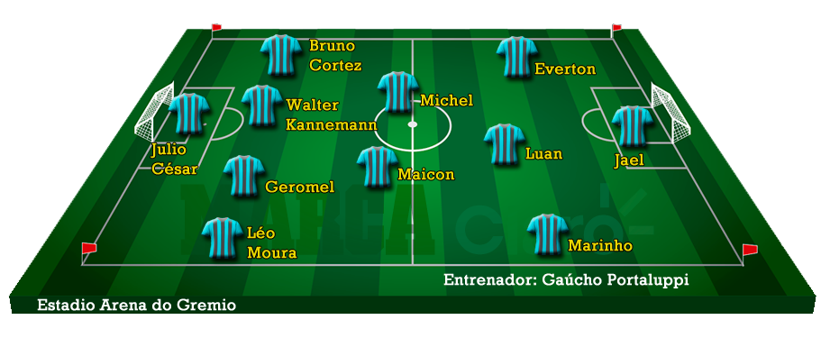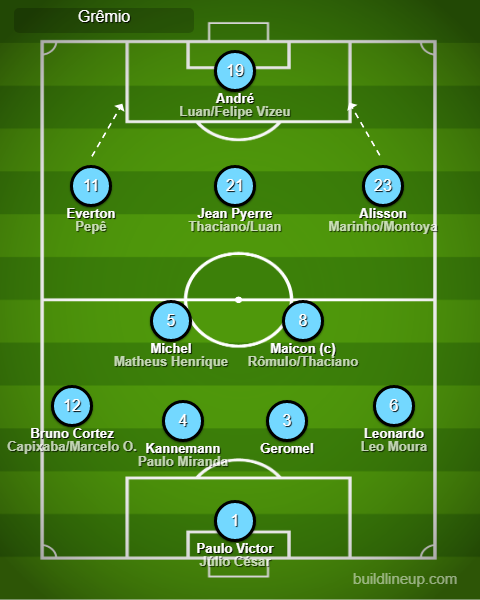 21 Jean Pyerre (MO): Médio ofensivo de elevada envergadura (1,83 m); Da formação do Grêmio; Muito jovem (21 anos); Bate bolas paradas, incluindo livres diretos; Remata bem de fora da área, em força ou em jeito; Trabalha defensivamente a condicionar a saída de bola do adversário, vigiando o médio cuja função é baixar para ajudar na construção; Qualidade de passe; Aparece no espaço entre linhas;