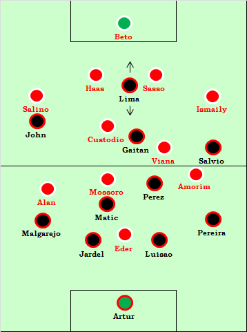 Mudança de 4x3x3 para 4x4x2 na segunda parte, com Castaignos ao lado de Montero;